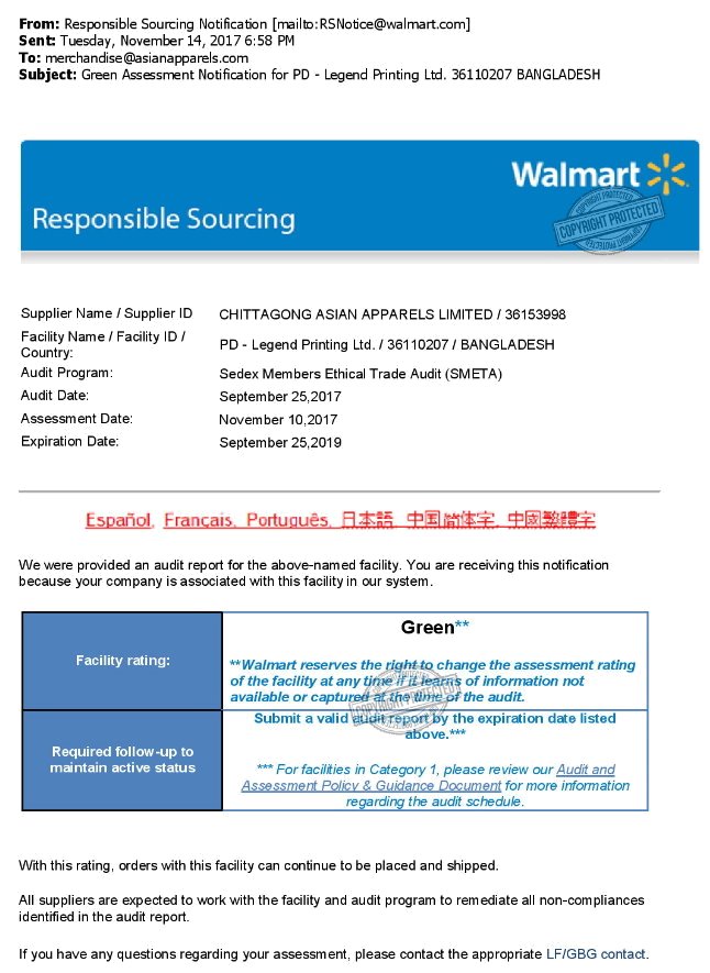 Walmart reviews third-party audit reports suppliers submit for the facility and assigns the facility a color rating based on the third-party program’s evaluation of the facility and Walmart’s own review of the report. The most common facility ratings are: